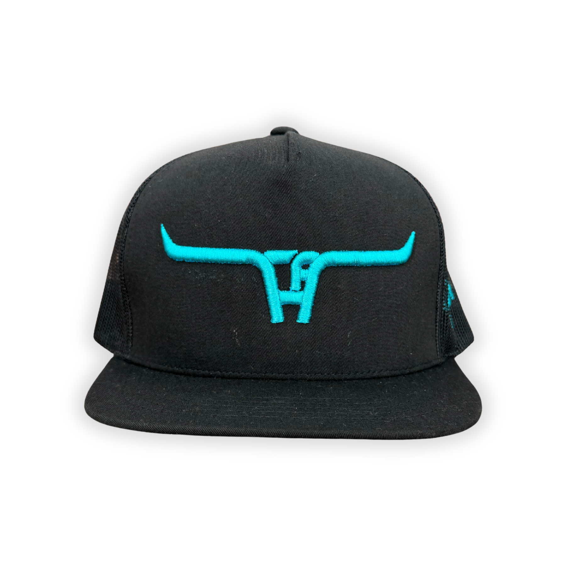 "CA Longhorn" Turquoise Puff - YOUTH CA 6006 Black/ Black Mesh, Snapback Cap