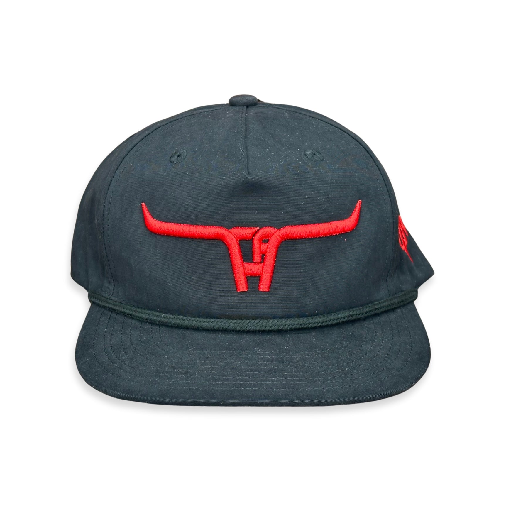 CA 256 style, snapback cap in black with black rope featuring our "Longhorn" stitch out in red puff!