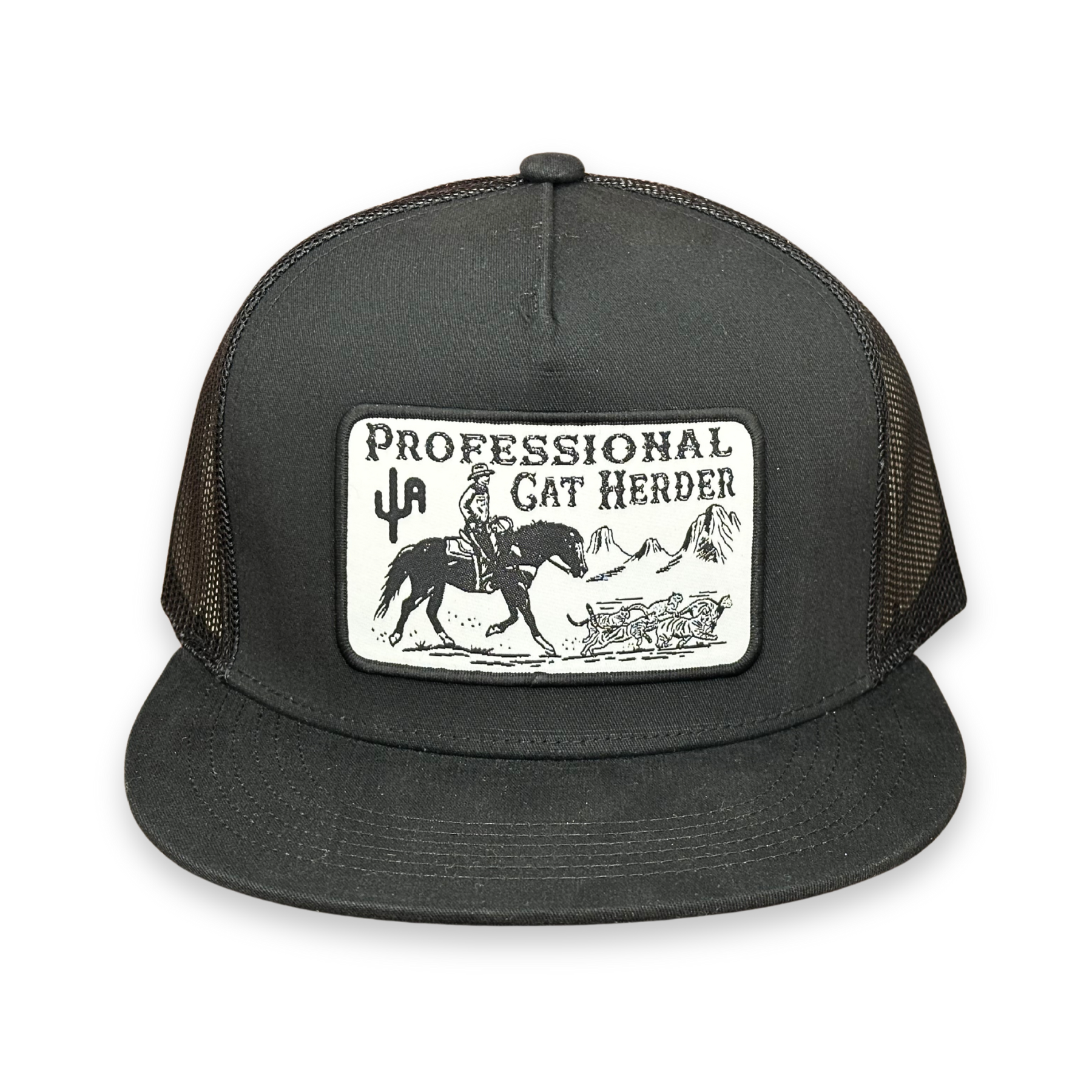 5 panel, 6006 style snapback hat in black with black mesh featuring our "Cat Herder" patch!