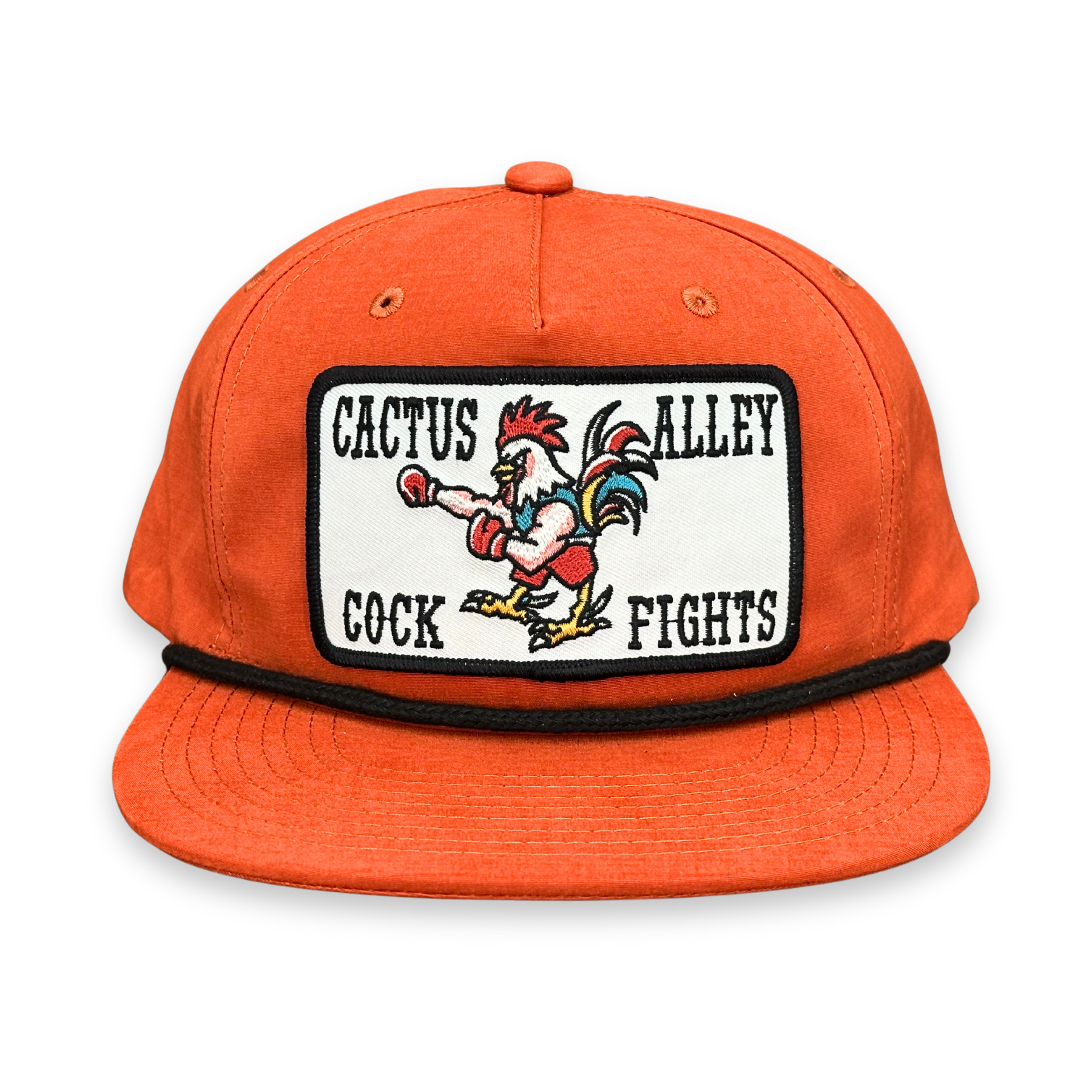 Cactus Alley 256 style snapback cap in dark orange with black rope featuring our "Cock Fights" patch!