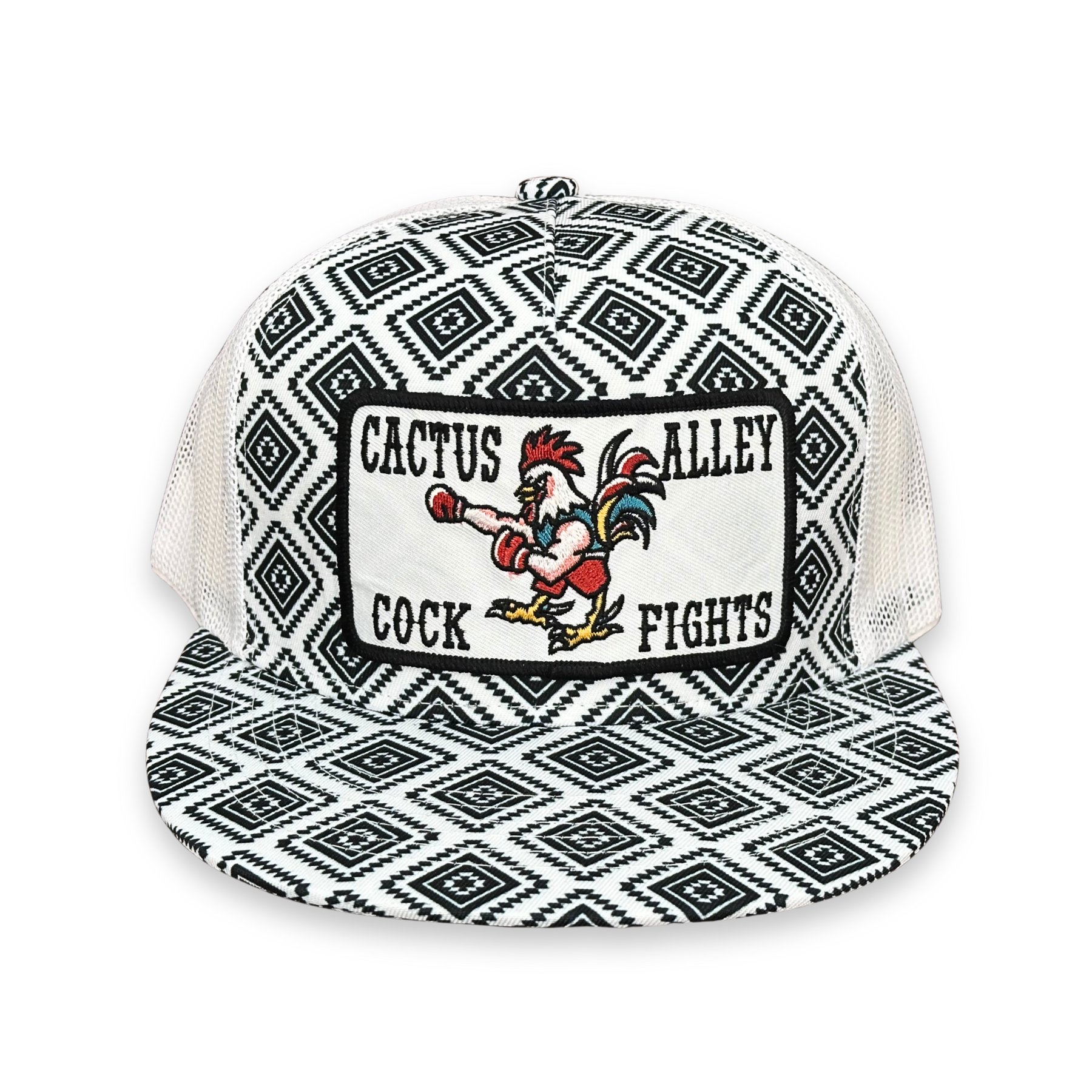 5 panel, CA black Aztec with white mesh snapback hat featuring our "Cock Fights" patch!