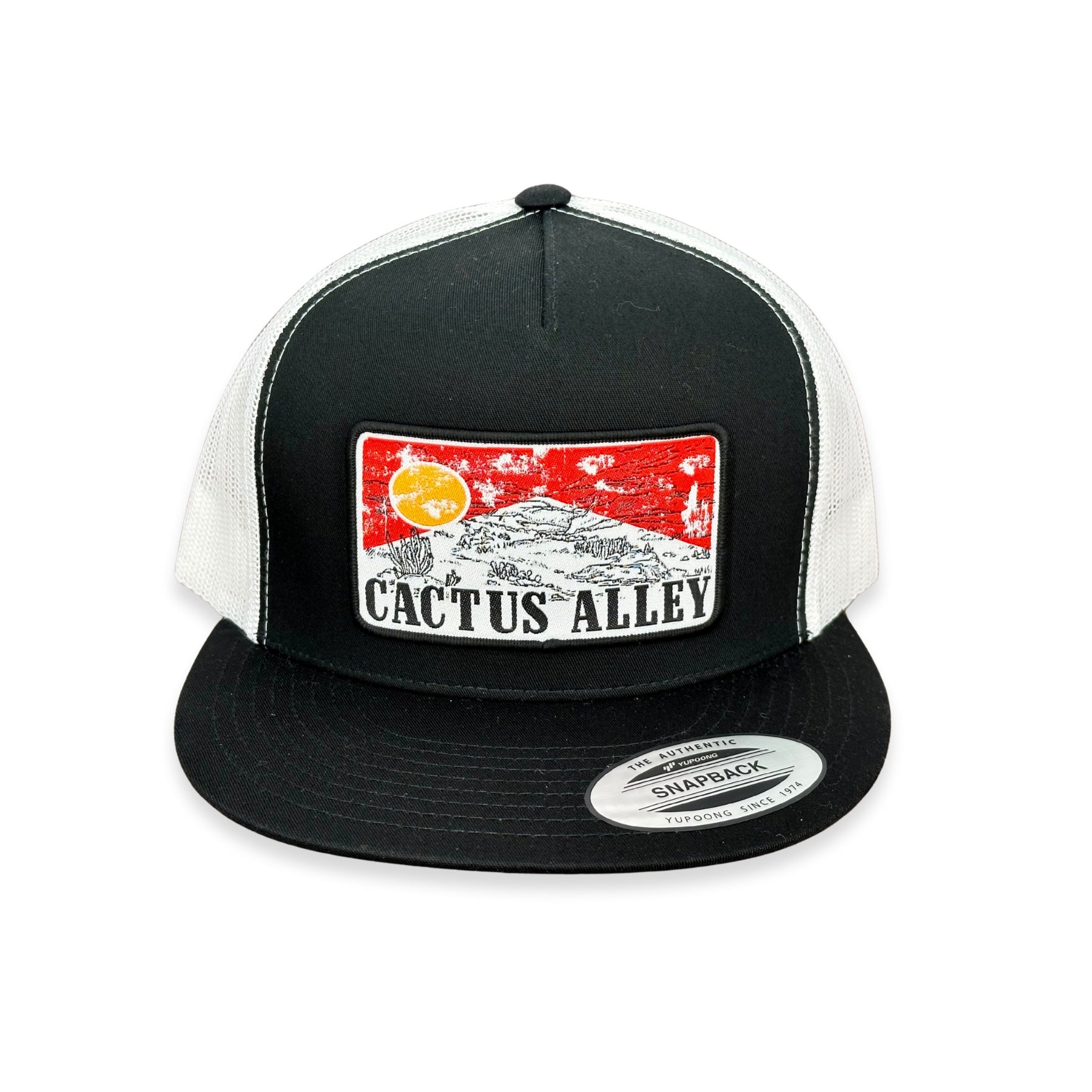 5 panel, 6006 style, adjustable back hat with black front and white mesh featuring our "Red Sky" patch!