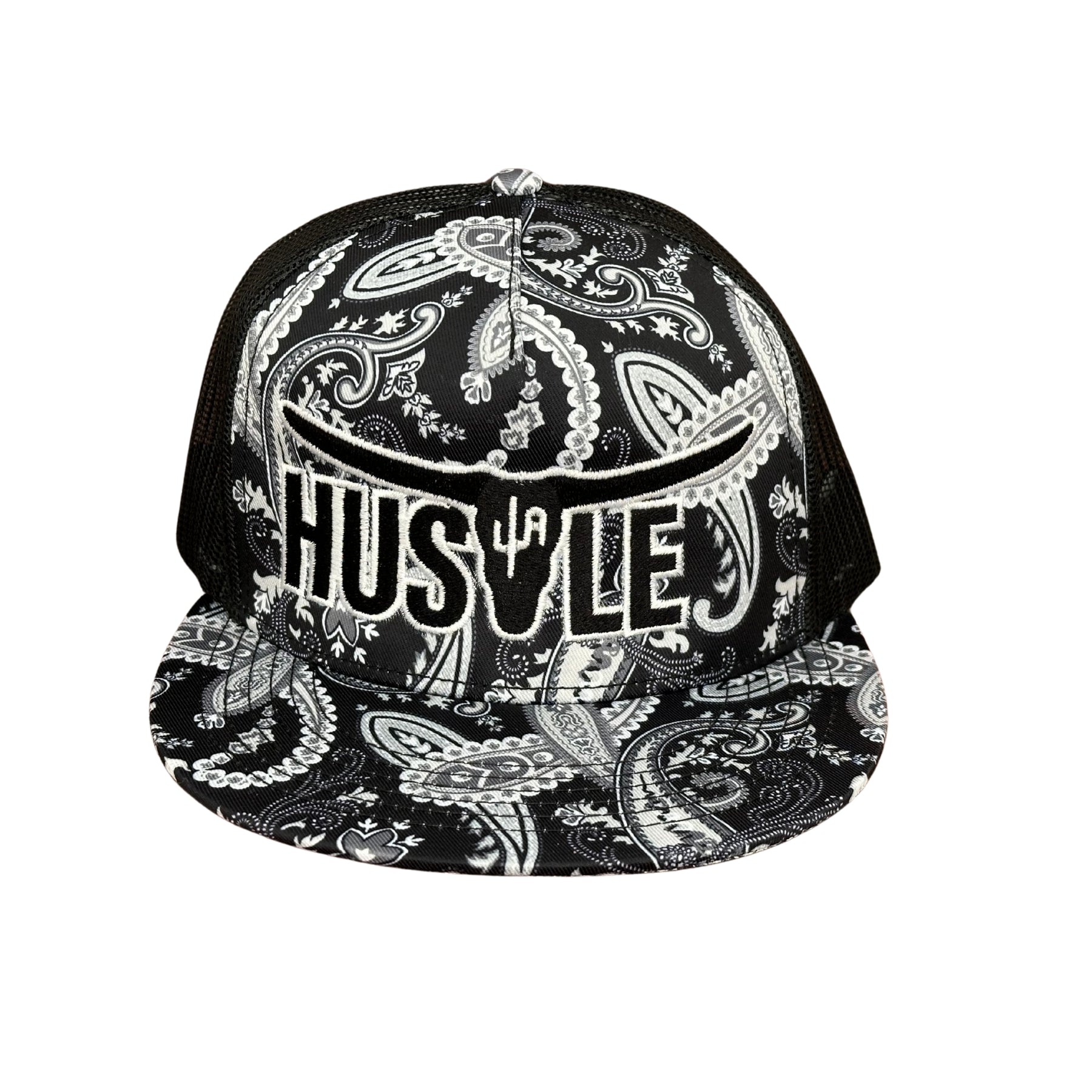 "Hustle" - Black Paisley with Black Mesh Snapback Cap