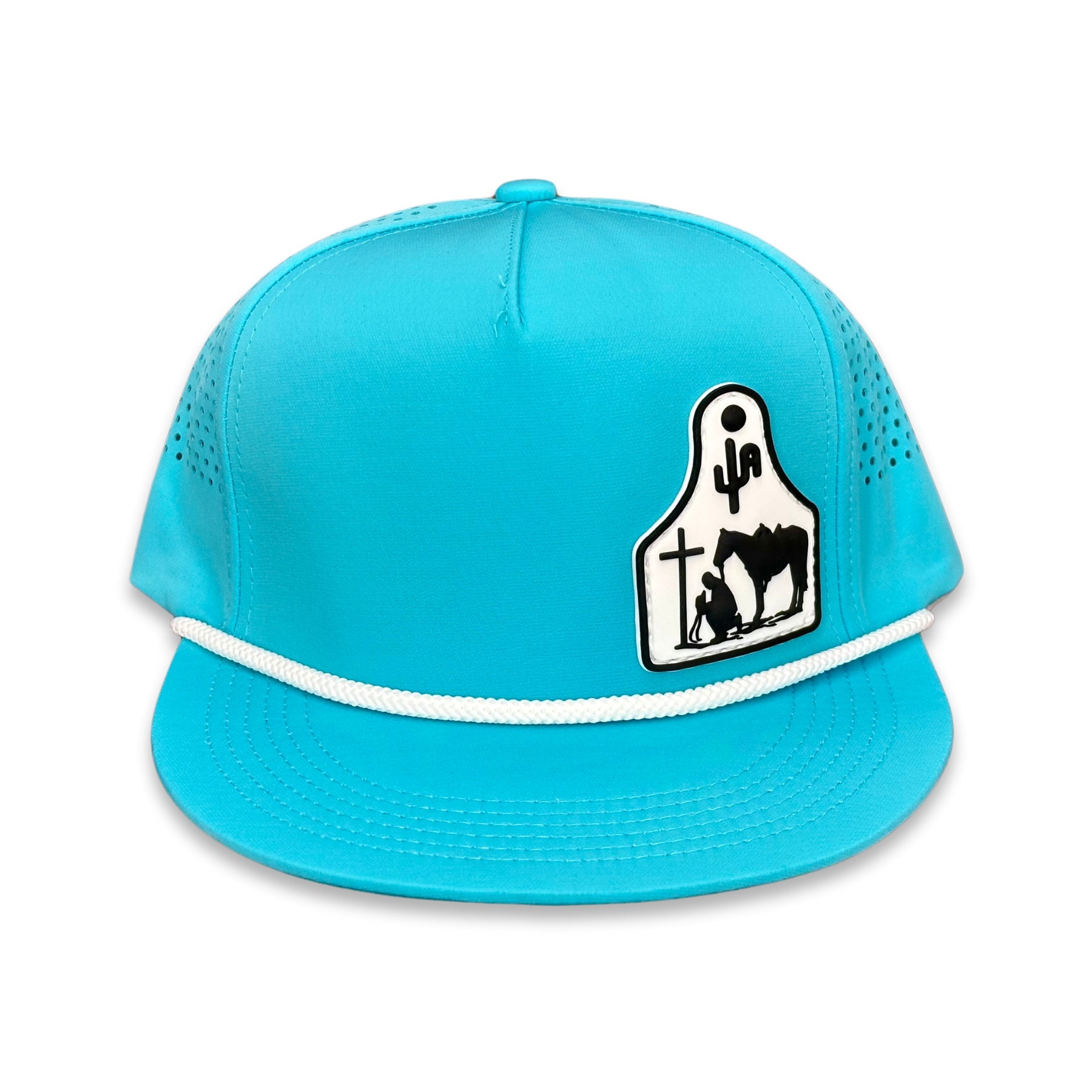 5 panel, CA turquoise with white rope, featuring lasered holes in the back, and our "Cowboy at the Cross" patch!