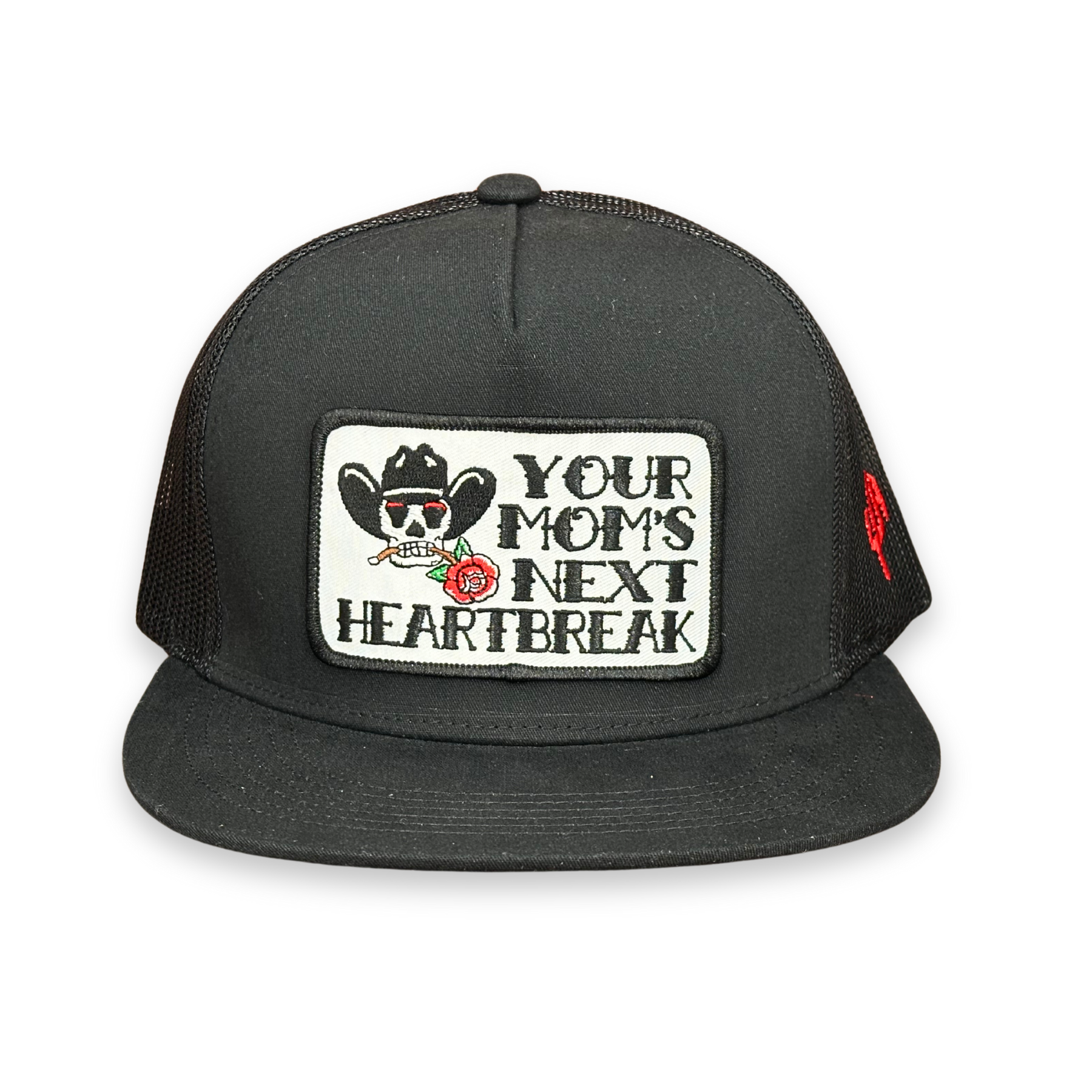 5 panel, 6006 style snapback hat in black with black mesh featuring our "Heartbreak Kid" patch!