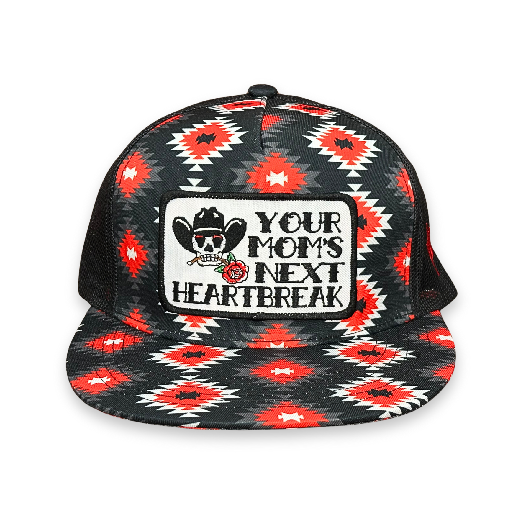 Cactus Alley Buddy Holly Aztec print with black mesh snapback cap featuring our "Heartbreak Kid" patch!