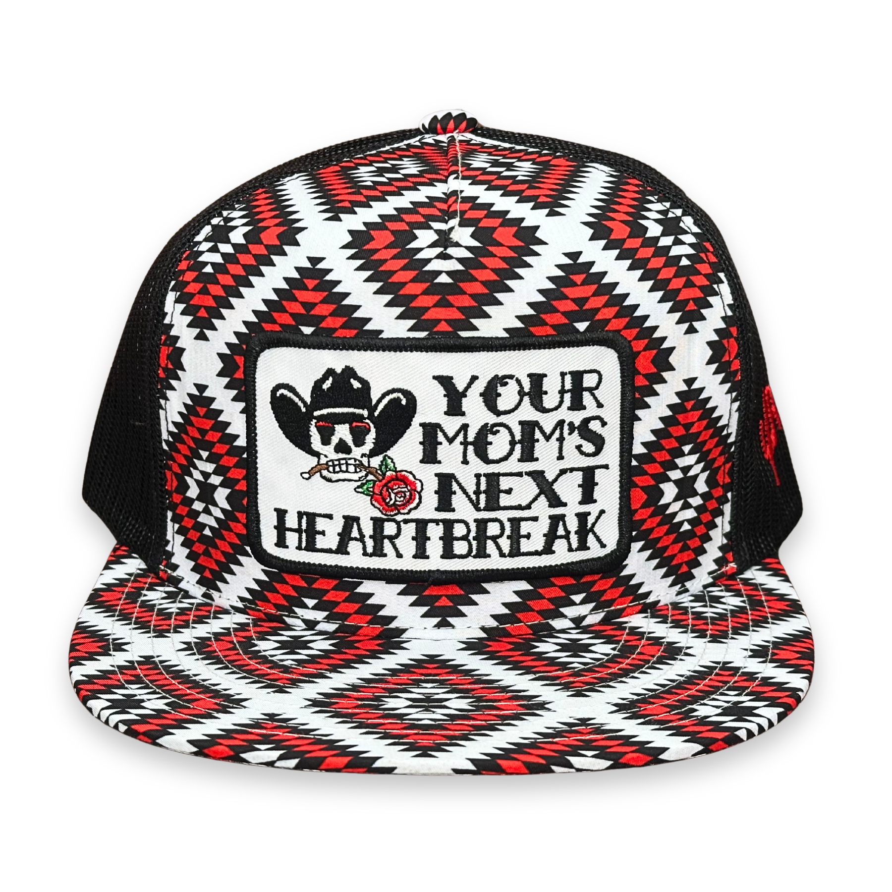 5 panel, CA black & red Aztec with white mesh snapback hat featuring our "Heartbreak Kid" patch!