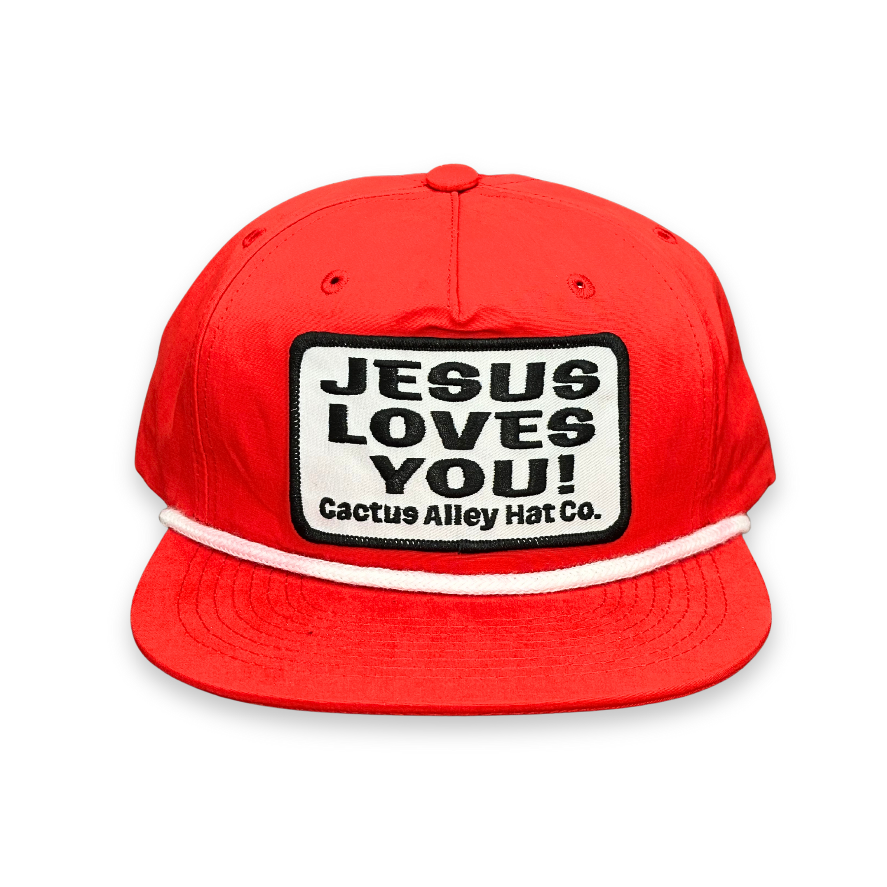 CA256 red with white rope, snapback cap featuring the “Jesus Loves You” patch.