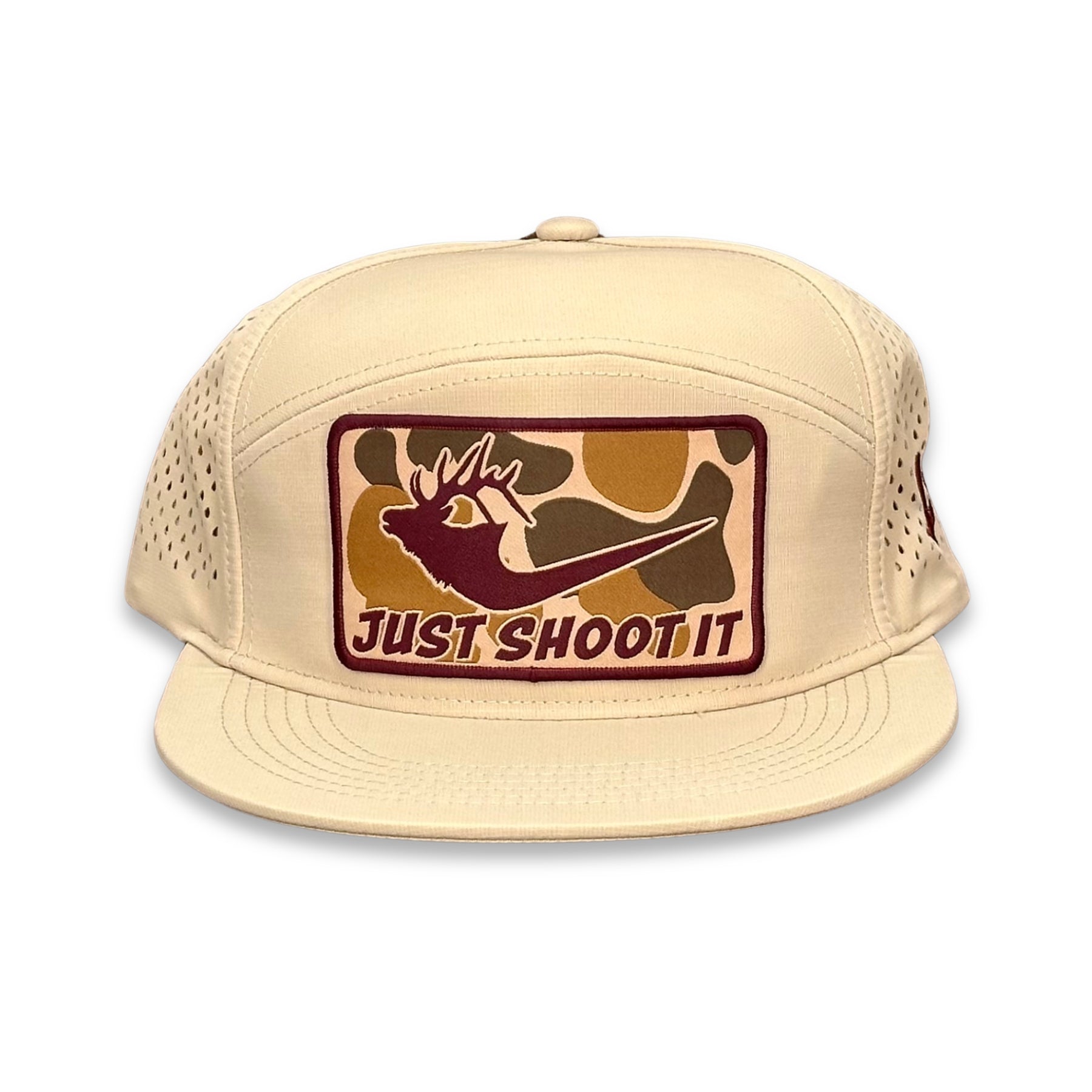 Zapped 7 panel, snapback cap in khaki with laser holes, featuring our "Just Shoot It Elk- Camo" patch!