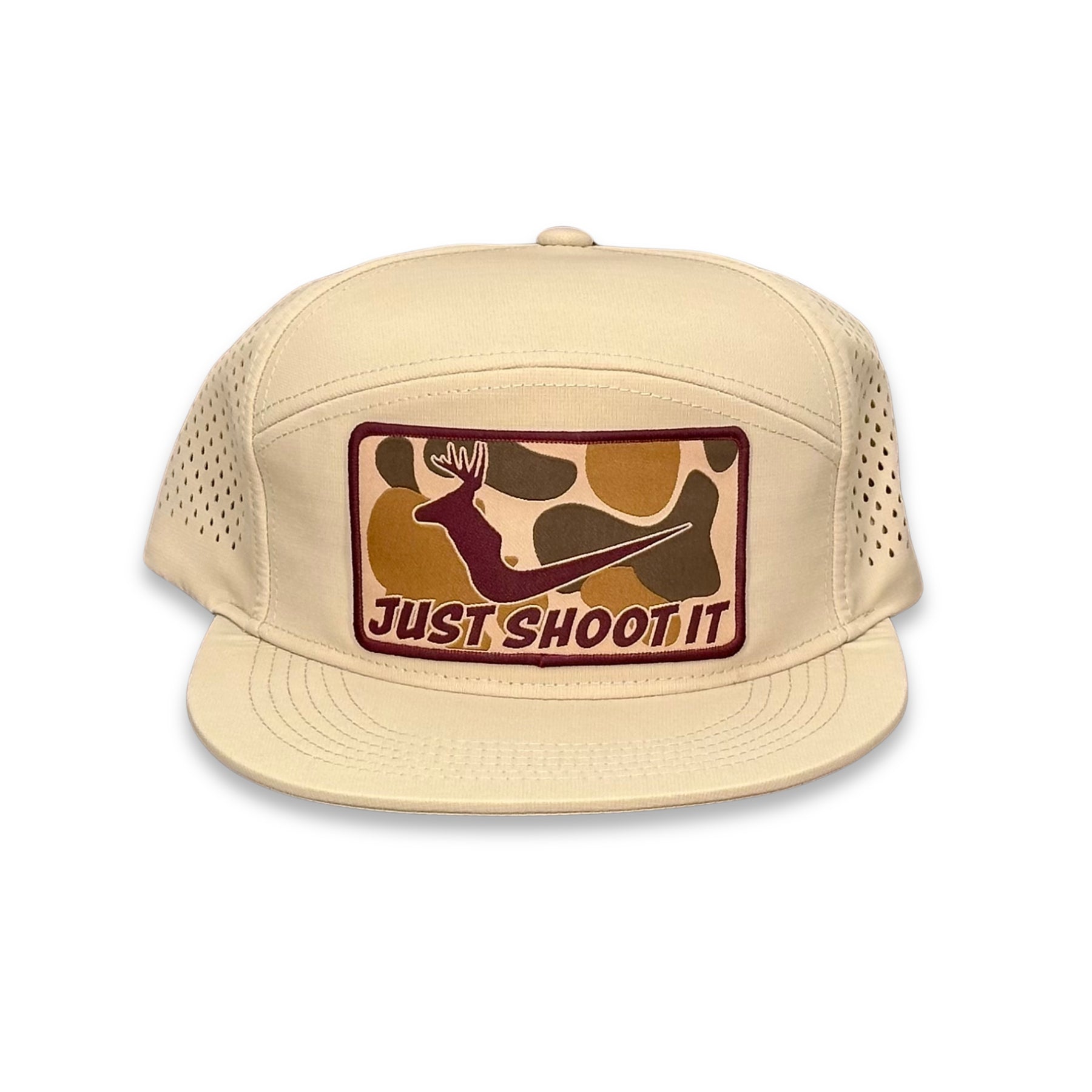 Zapped 7 panel, snapback cap in khaki with laser holes, featuring our "Just Shoot It White Tail- Camo" patch!