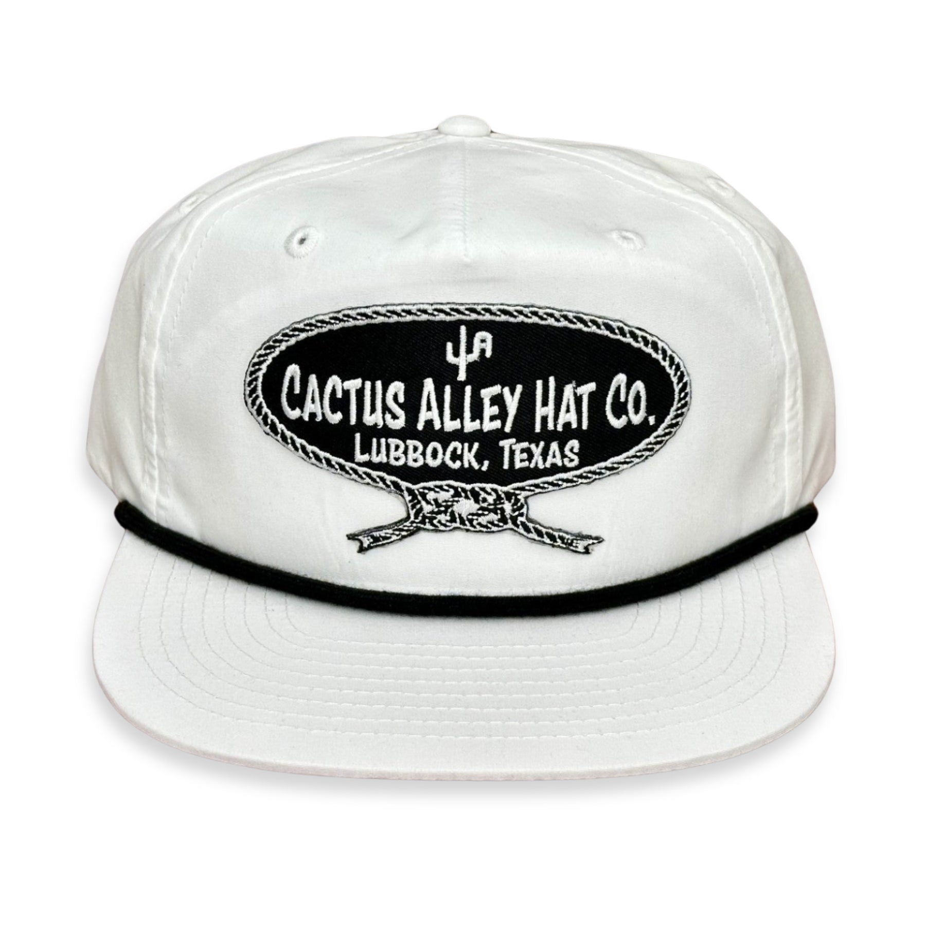 CA 256 style, snapback cap in white with black rope featuring our "Neck Rope-BLK" patch!