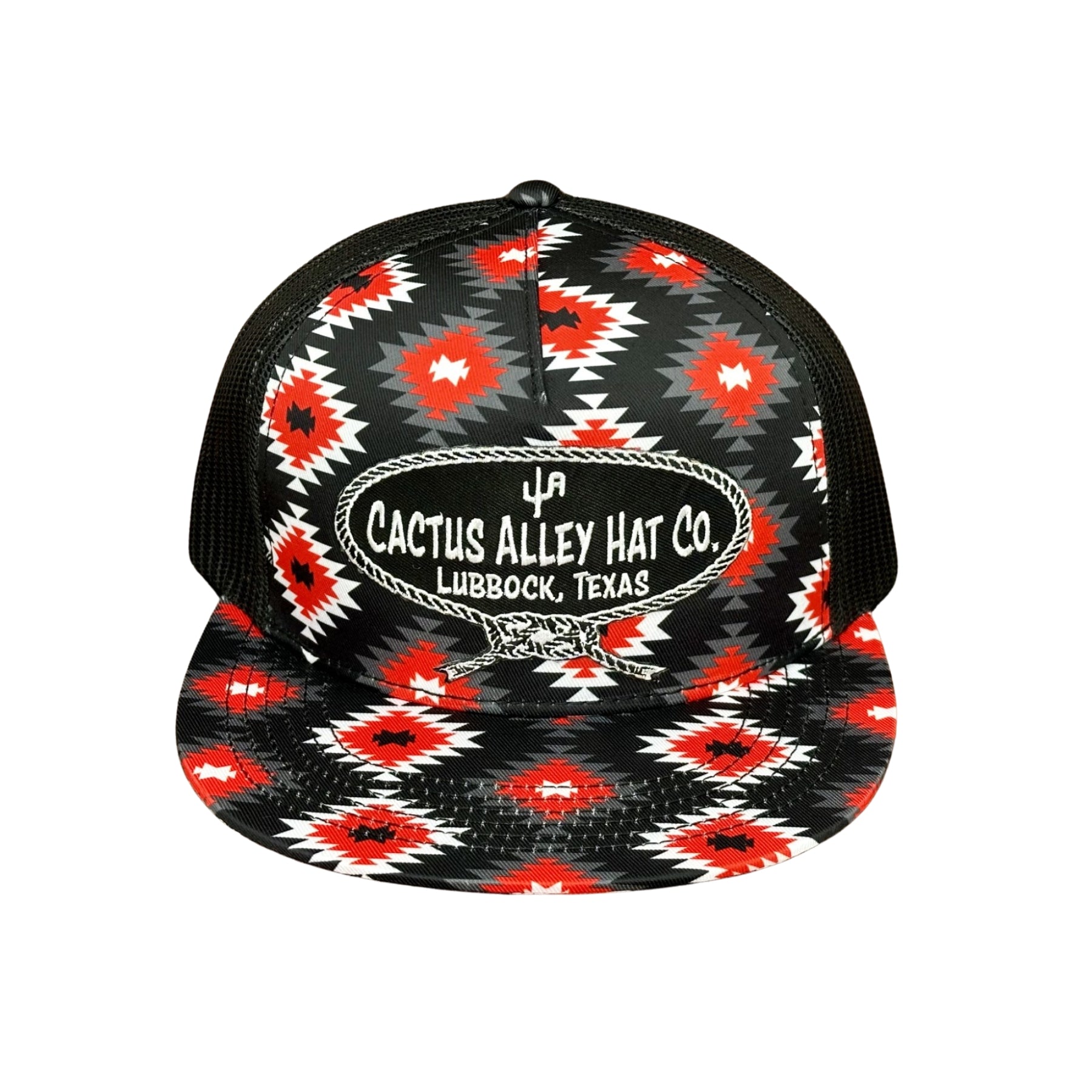 Cactus Alley Buddy Holly Aztec print with black mesh snapback cap featuring our "Neck Rope-BLK" patch!