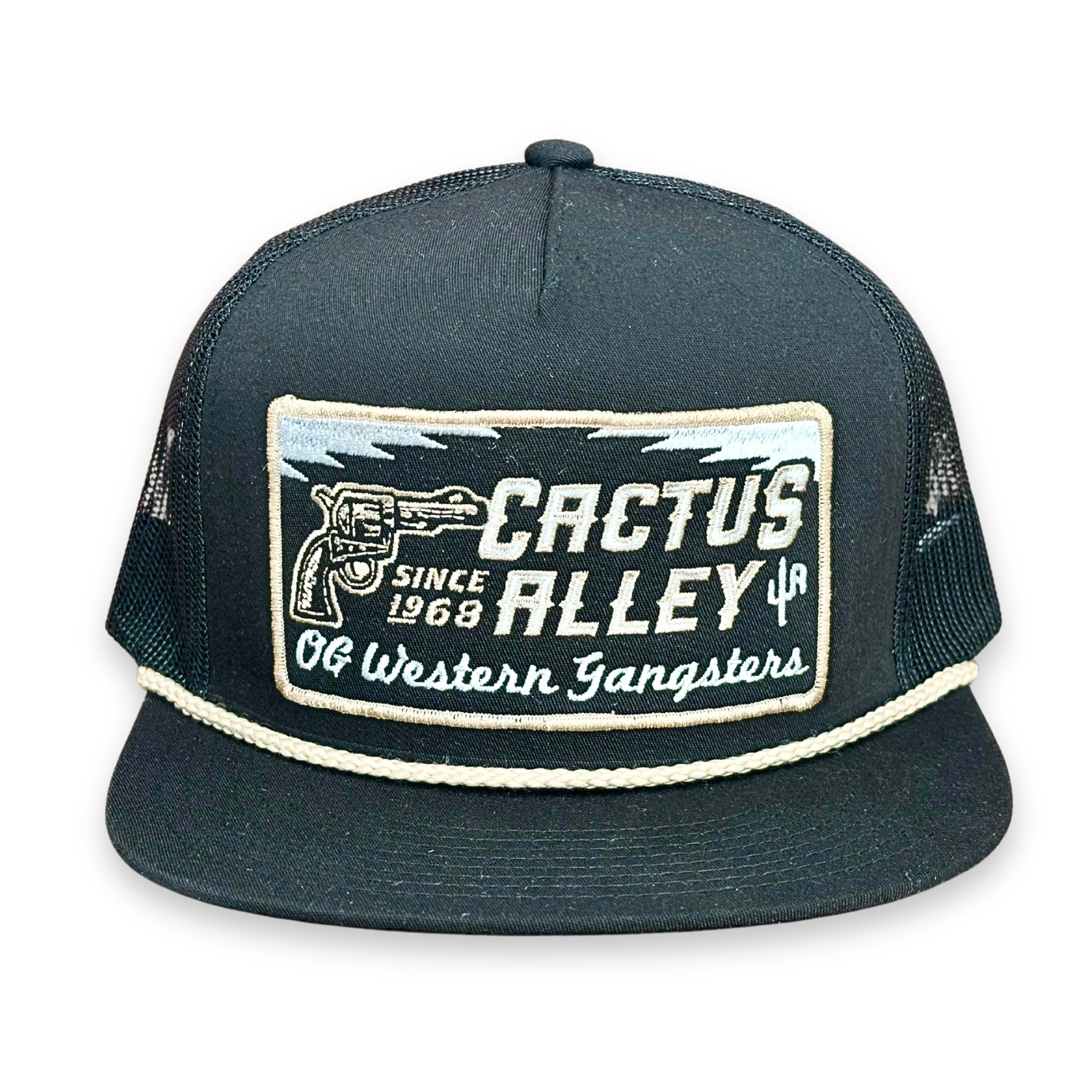 CA 6006 style snapback hat in black with black mesh and a gold rope featuring our "OG Gangster" patch!