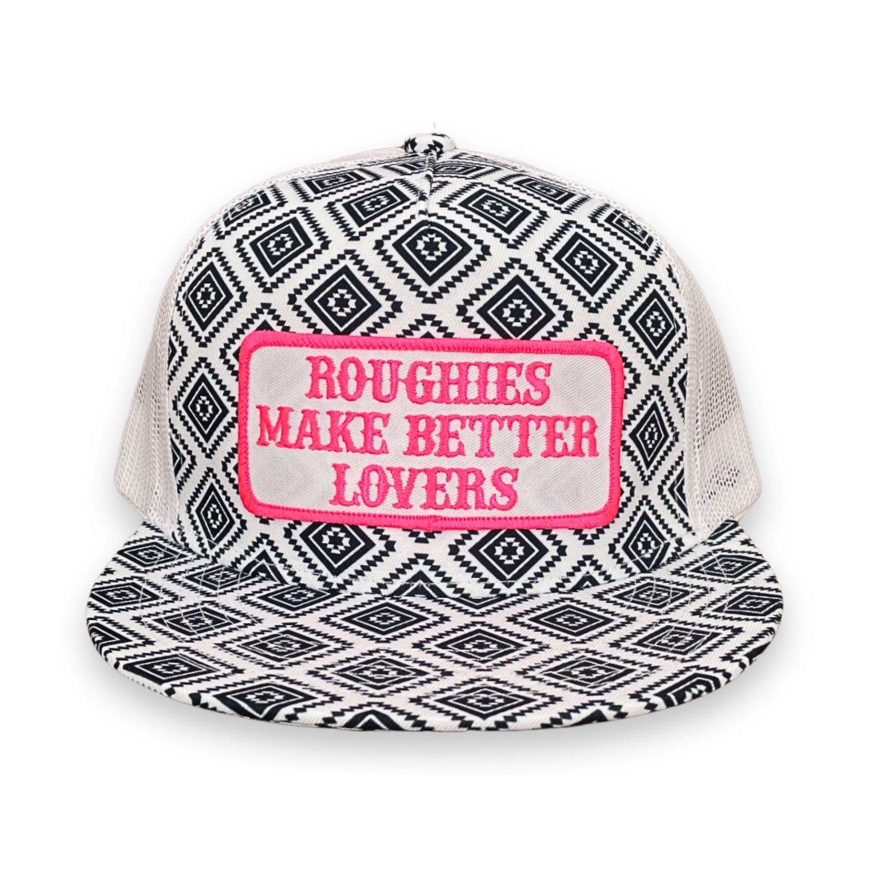 5 panel, CA black Aztec with white mesh snapback hat featuring our "PW Roughies BL" patch!