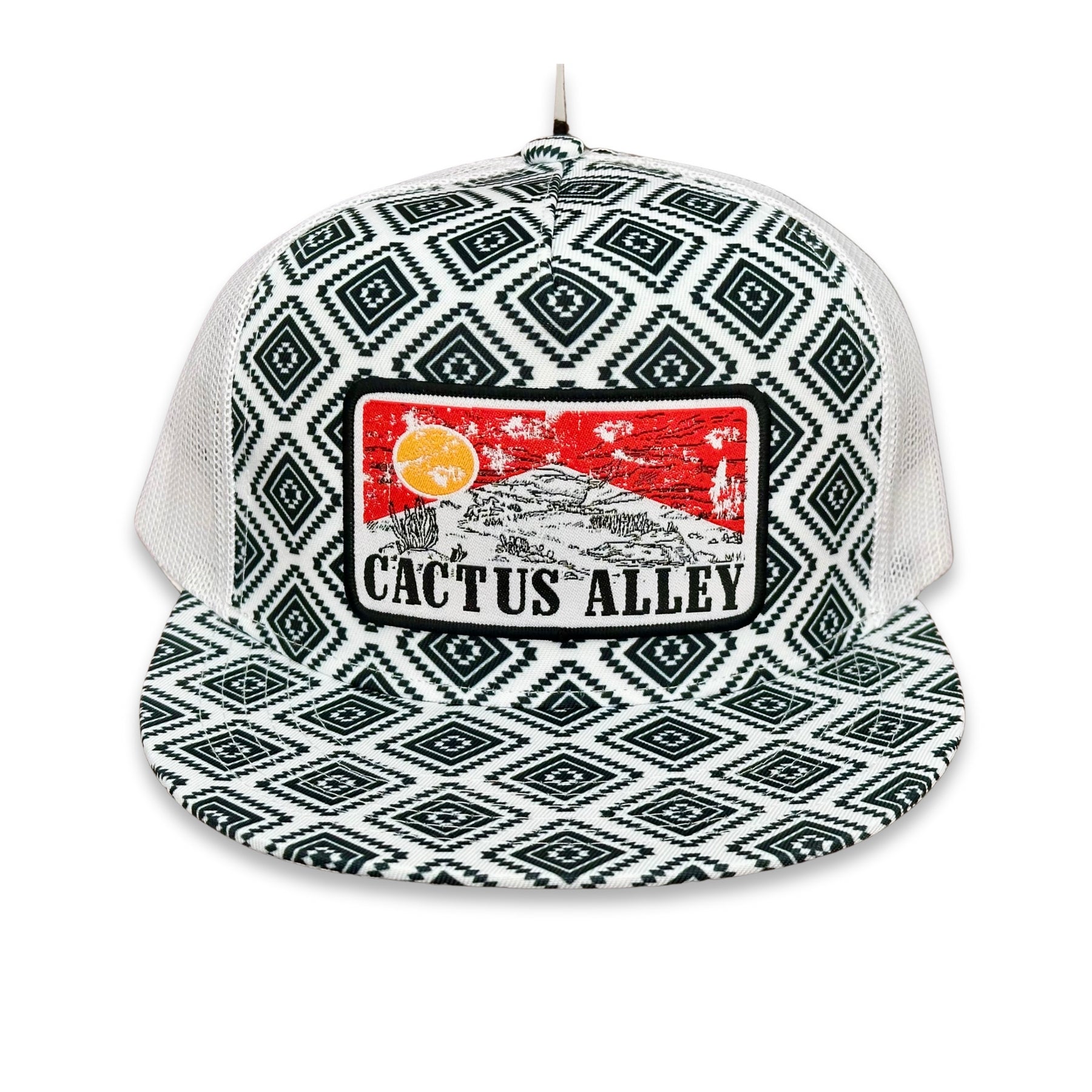 Cactus Alley black and white Aztec print with white mesh snapback cap featuring our "Red Sky" patch!