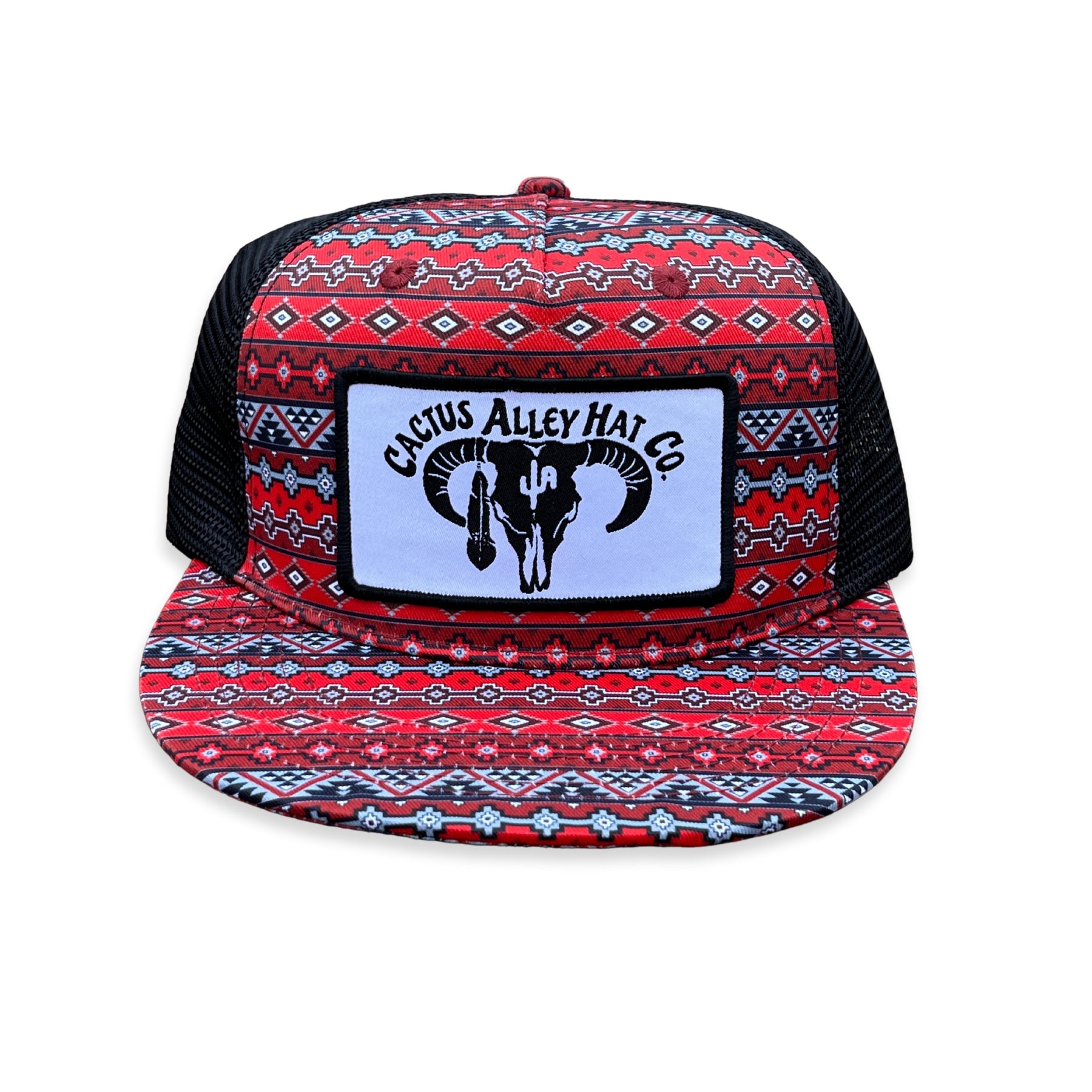 CA red Aztec with black mesh snapback cap featuring our “Southwest” patch!