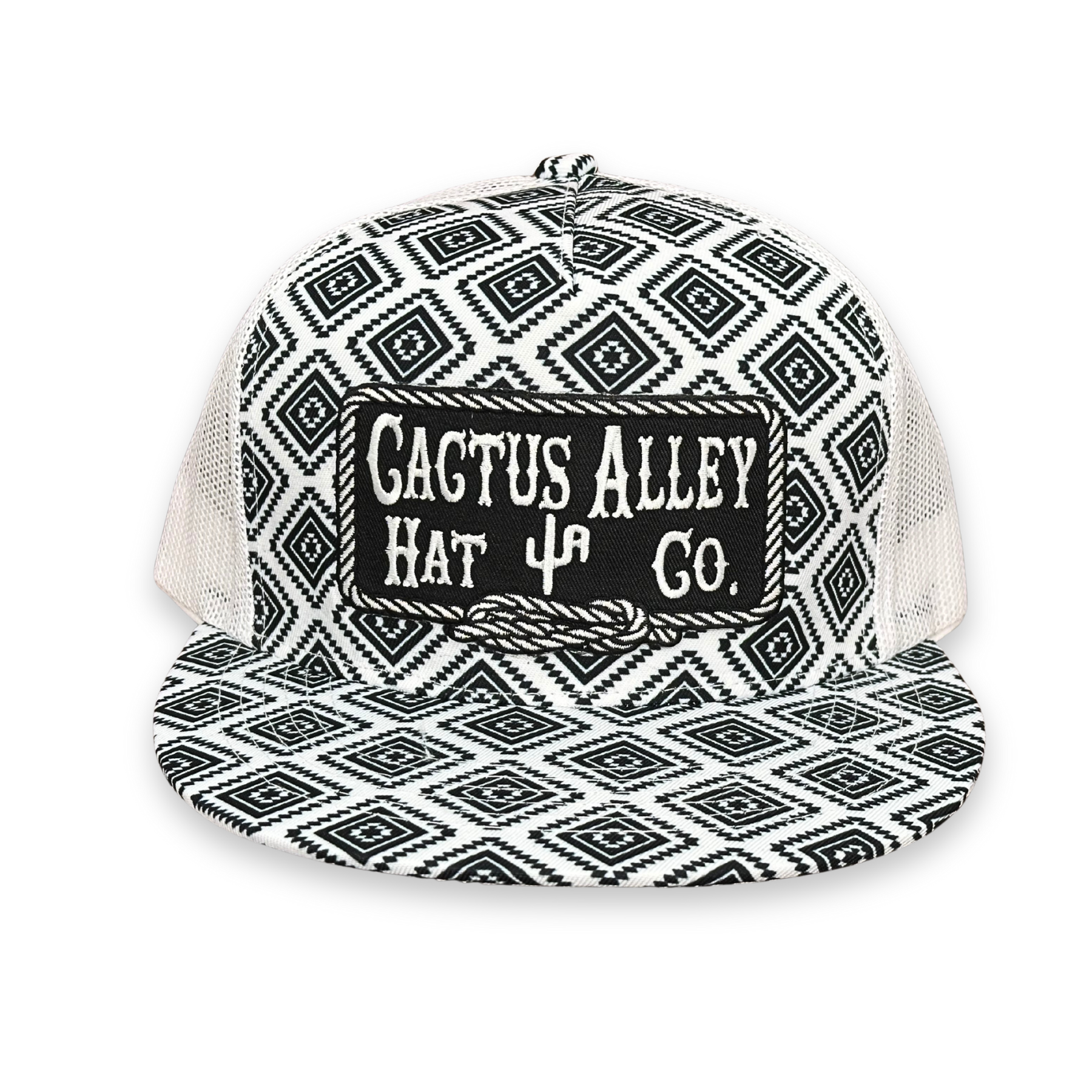 5 panel, CA black Aztec with white mesh snapback hat featuring our "Square Knot-BLK" patch!